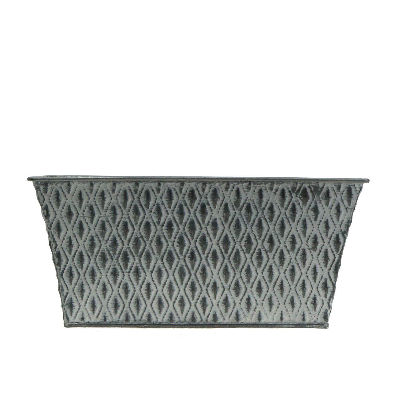 Den rektangulære sinkpotten med diamantmønster måler omtrent 26 x 15,5 centimeter. Høyden er rundt 12 centimeter.
