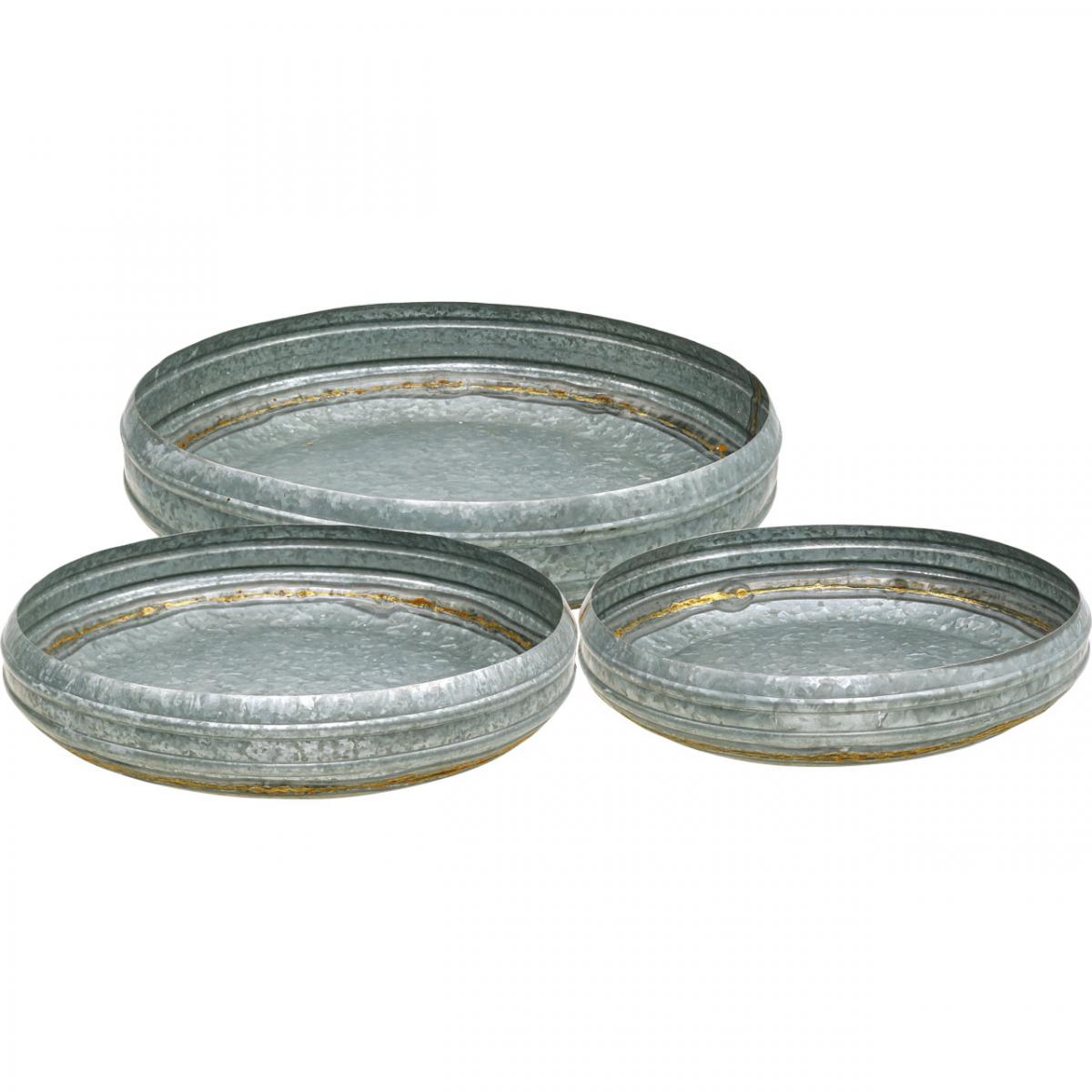 Disse tre sinkskålene har en rustikk antikk design. Kunstige tegn på slitasje og rust gjør metallskålene autentiske.Den buede kanten går mer innover mot åpningen. Denne produksjonen får metallskålene til å fremstå ganske svulstige. Kanten er utformet med riller. Den viser rust og tegn på slitasje igjen og igjen, noe som understreker den antikke stilen til metalldekorasjonen.