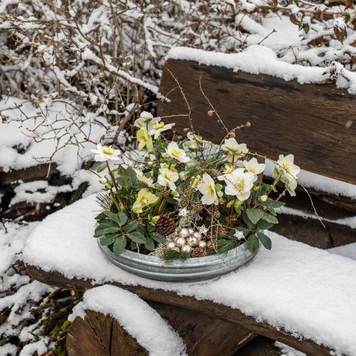Du kan presentere mange ting i de rustikke dekorative skålene laget av sink. Bruk for eksempel kunstige flate planter som sukkulenter. Lag en antikk lysdekorasjon med steiner eller grønne grener eller bær. Et attraktivt design med større dekorative steiner eller en kunstig steinhage kan også ordnes i sinkskålen.
