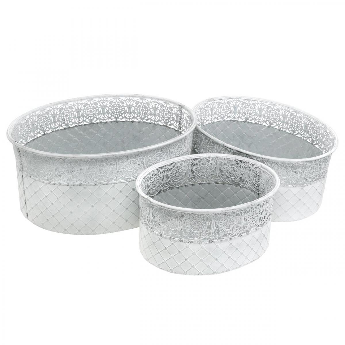 Skål for planting, metallkar med blondemønster, dekorativ potte oval hvit, sølv shabby chic L41,5/35/29,5 cm H19/16/14,5 cm sett med 3