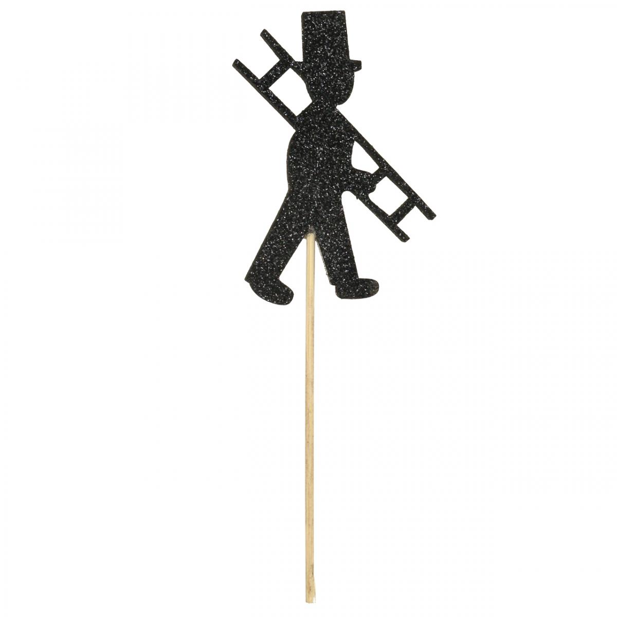 Nyttårspynten består av 24 små skorsteinsfeier på en trepinne. De dekorative figurene har silhuetten av en skorsteinsfeier i en topplue som bærer en stige. Blomsterpluggene er farget i en elegant sort med glitter, som avgir en liten gnist.
