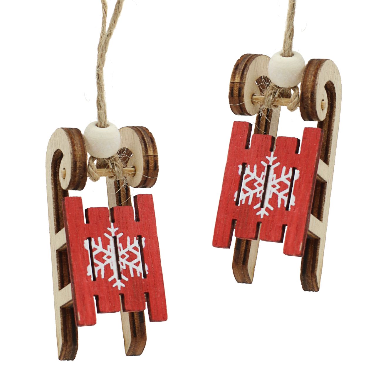 Du får de røde sledene for oppheng i et praktisk sett med 12 stykker, som er laget utelukkende av tre og raffia. Lengden deres er omtrent 6 centimeter, lengden med snorer er omtrent 14 centimeter. Høyde og bredde er hver ca. 2,5 centimeter.