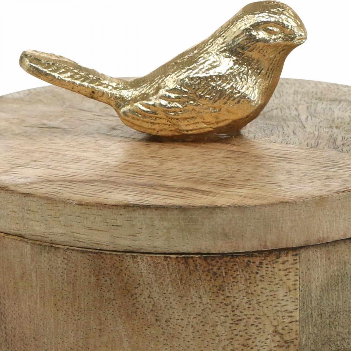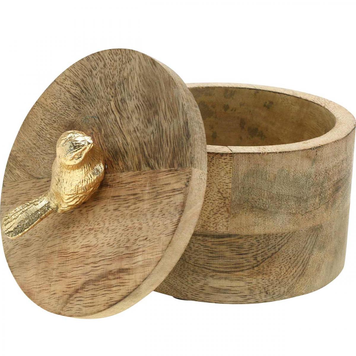 Smykkeskrin med fugl, fjær, dekoboks laget av mangotre, ekte tre naturlig, gylden H11cm Ø12cm