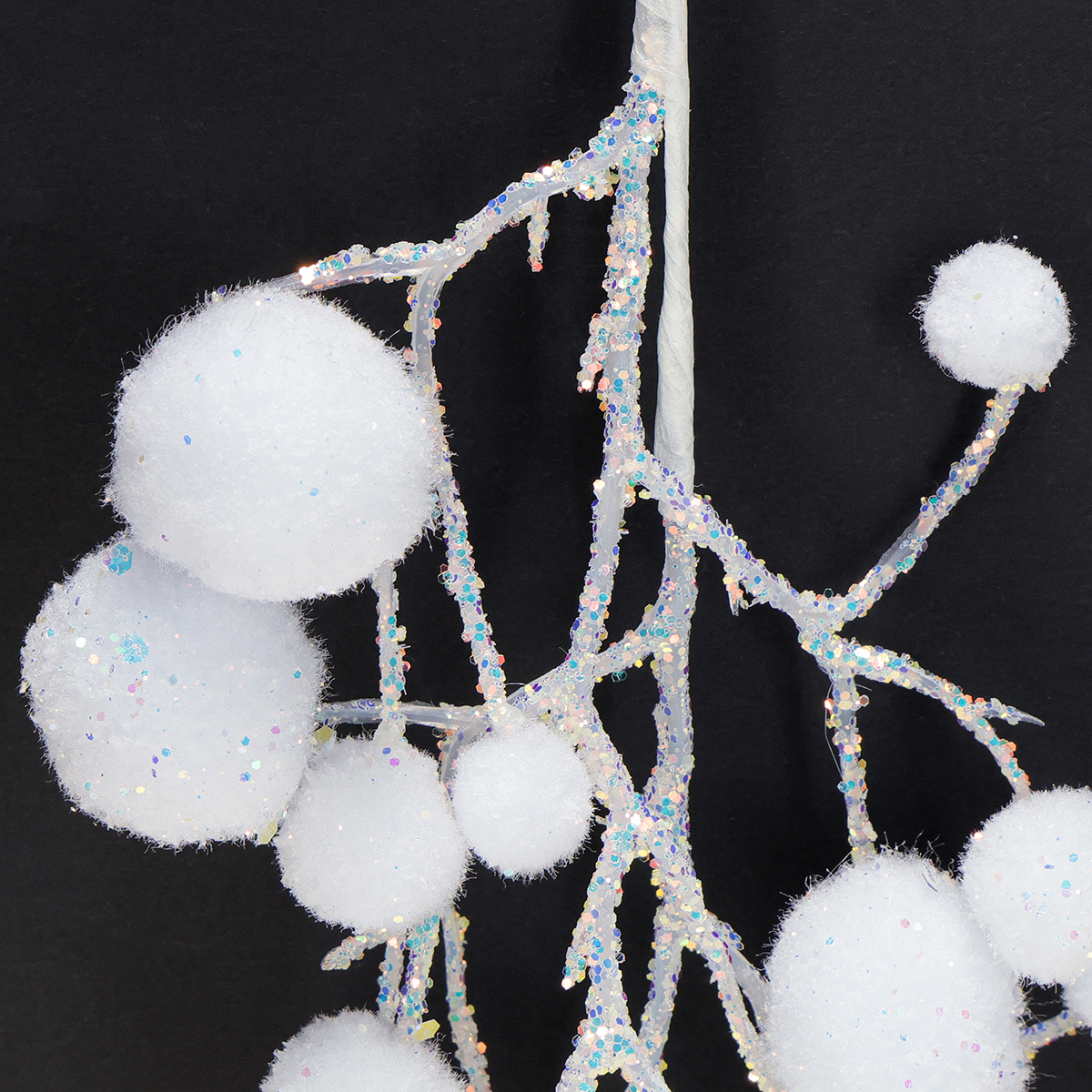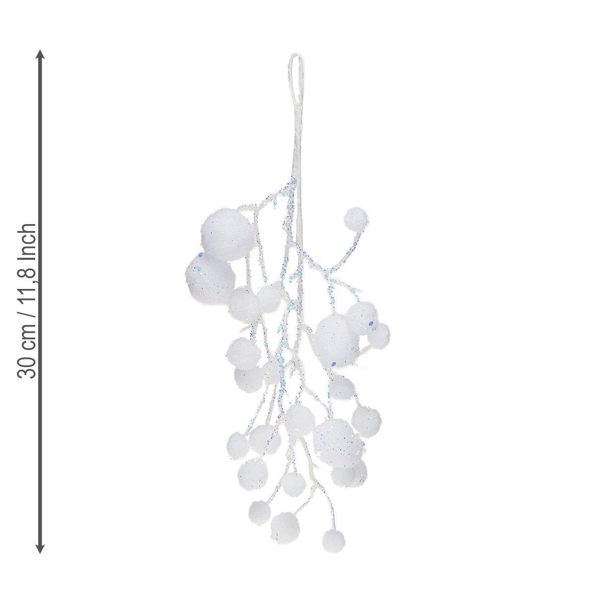 Den hvite snøfnuggdekorasjonen med iriserende glitter er omtrent 30 centimeter lang. Diameteren på snøballene er omtrent 1,5–3 centimeter.