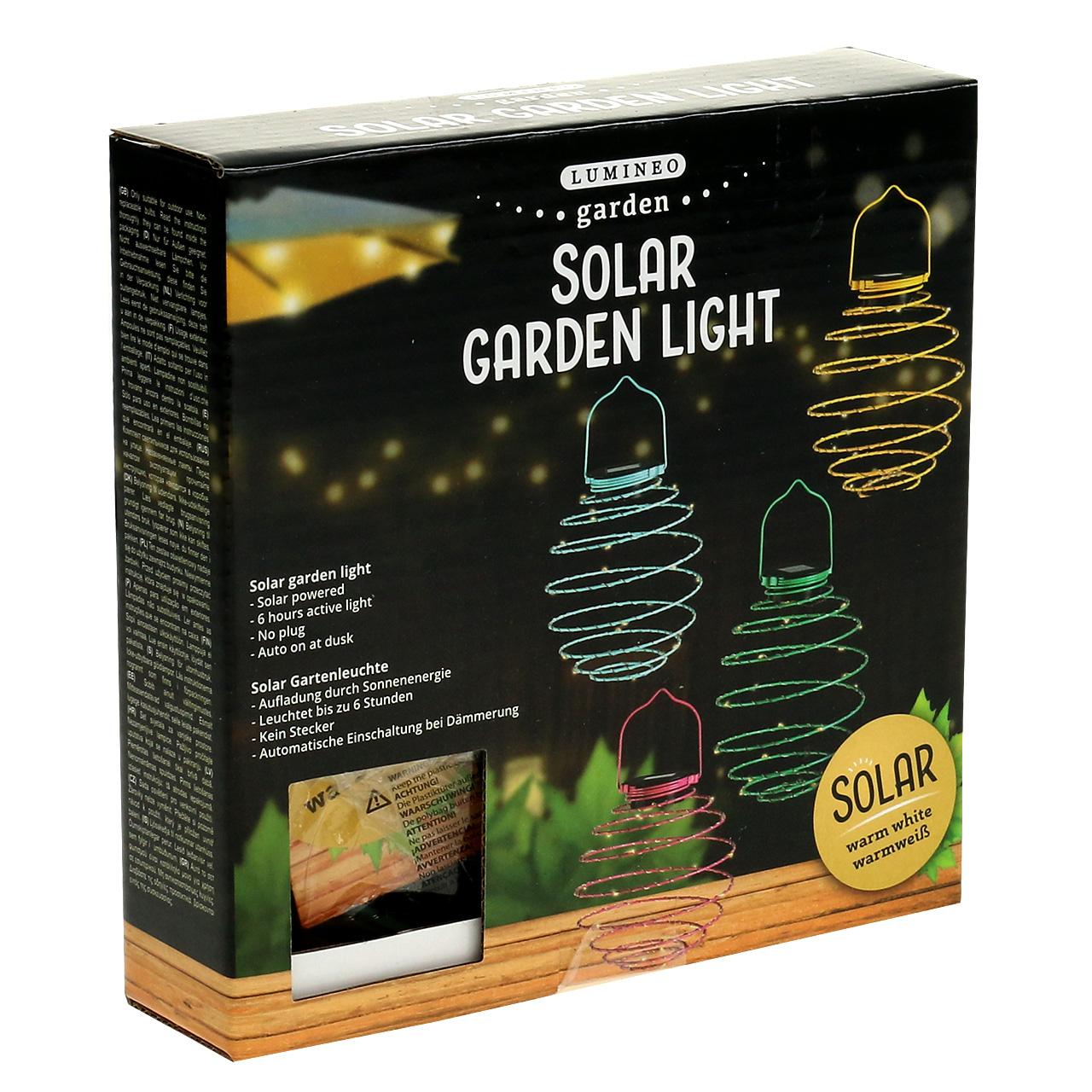 Solar hage lys i grønt med 25 lysdioder i varm hvit er ca 2,5 centimeter når den er brettet og ca 22 centimeter i høyden når den henges. Diameteren er omtrent 16 centimeter.