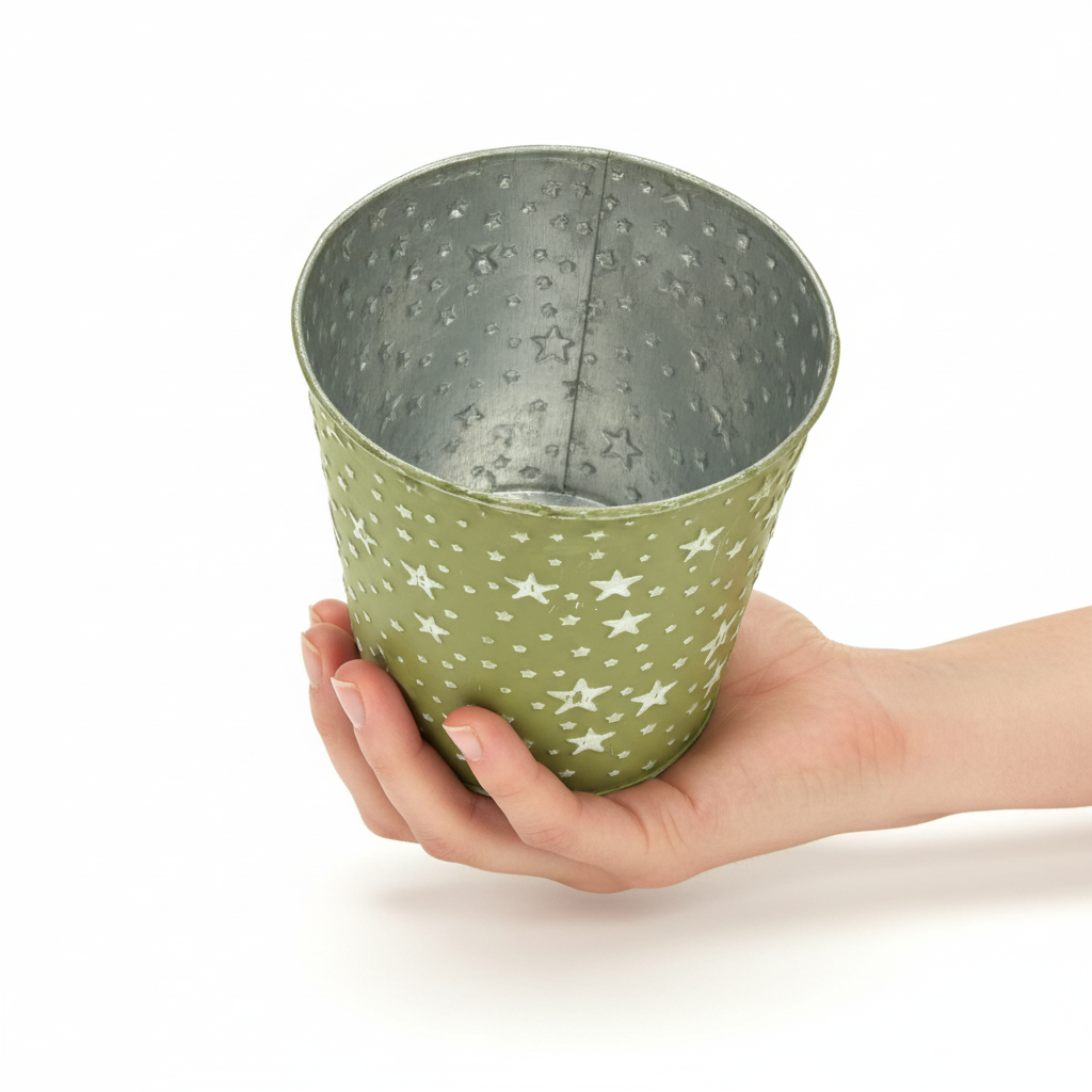- Blomsterpotte i metall preget med stjerner