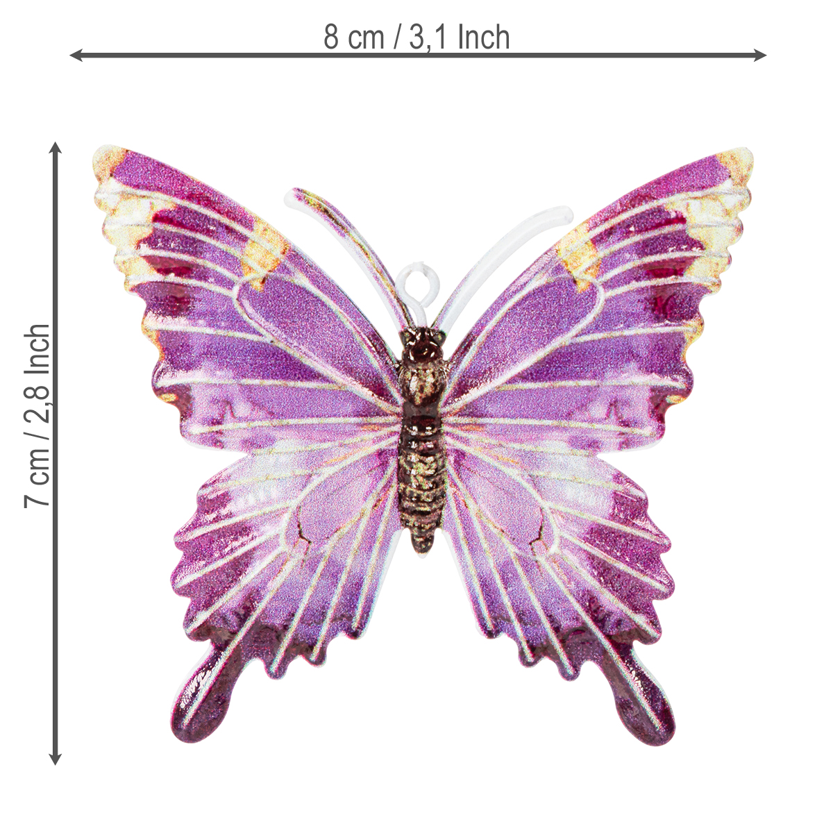 Dette sommerfuglanhengssettet imponerer med sin harmoniske kombinasjon av funksjonalitet og estetisk sjarm. Med en høyde på 8 centimeter og en bredde på bare 0,5 centimeter er de verken for små eller for store – perfekt proporsjonert for vindusdekorasjoner, veggkunst eller til oppheng på grener eller kvister. Den lette vekten gjør at de kan plasseres hvor som helst uten å legge til vekt.