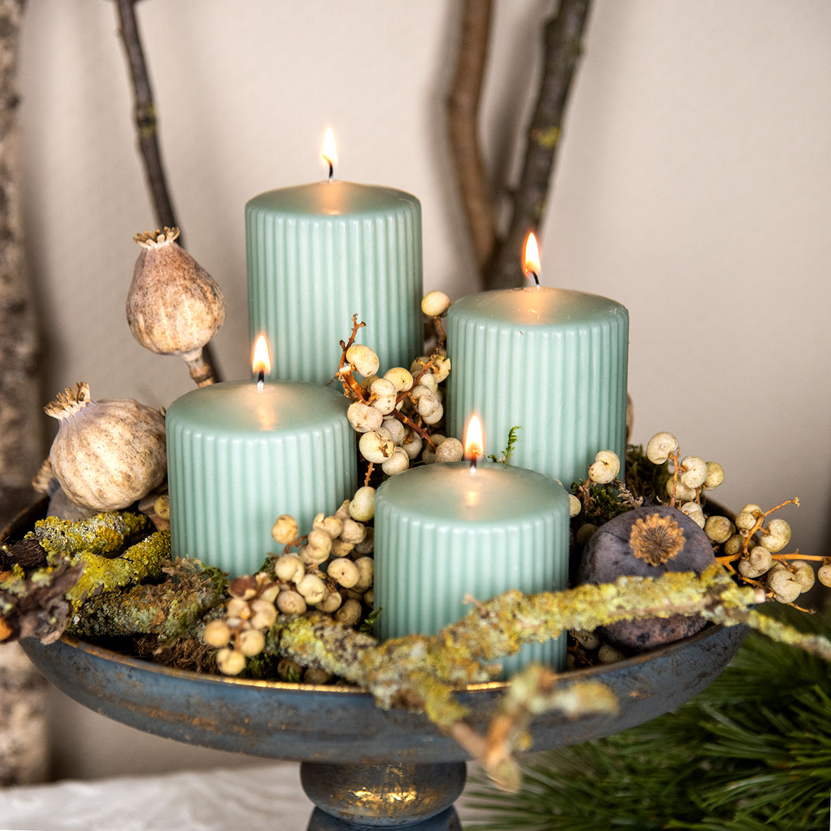 De avrundede rillene gjør at de smaragdgrønne lysene fremstår spesielt eksklusive og er ikke bare imponerende som adventslys. De grønne søylelysene er ikke gjennomfarget.