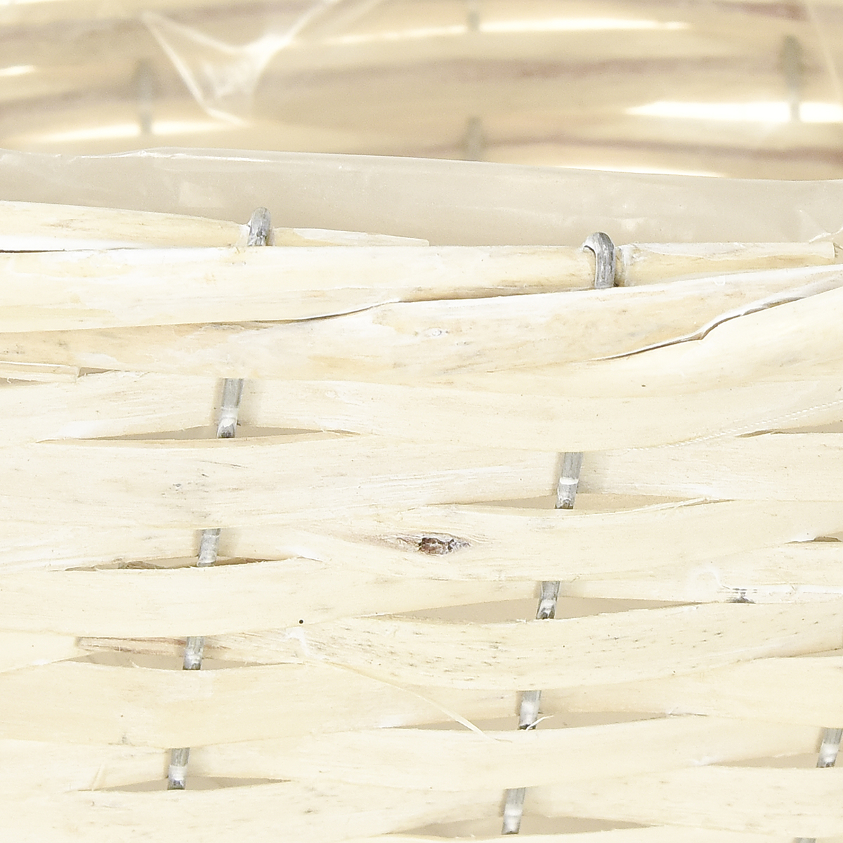 Sponplatekurven er laget av lyst piletre, vasket hvitt og vevd på en solid metallramme, noe som gir den både et naturlig utseende og stabilitet. Plantefilmen øker designfleksibiliteten og gjør kurven ideell for kreative planteideer.