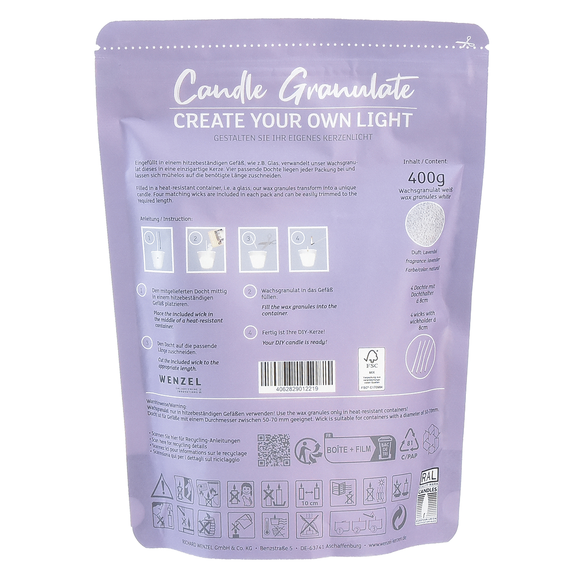 Oppdag magien ved å lage den selv med vår stearinlyssand inkludert veke. Med den enkle påføringen av voksgranulatene kan du lage dine egne duftende drømmelys på kort tid. Enten som dekorasjon eller for å bringe den behagelige duften av lavendel inn i hjemmet ditt, er produktet vårt ideelt for kreative mennesker, håndverksentusiaster og alle som ønsker å legge til spesielle aksenter til deres atmosfære.