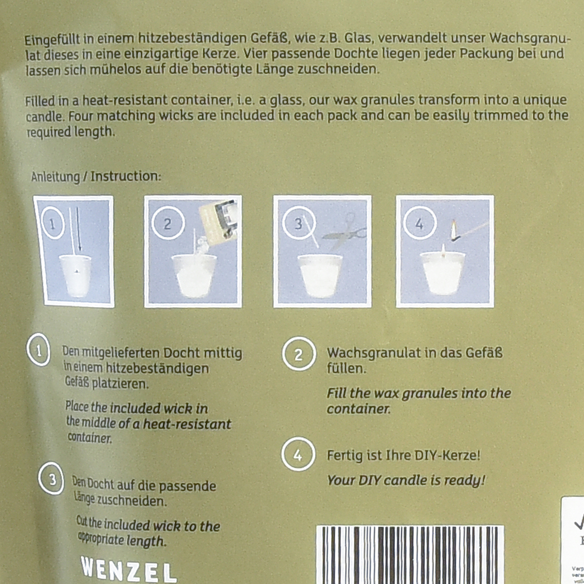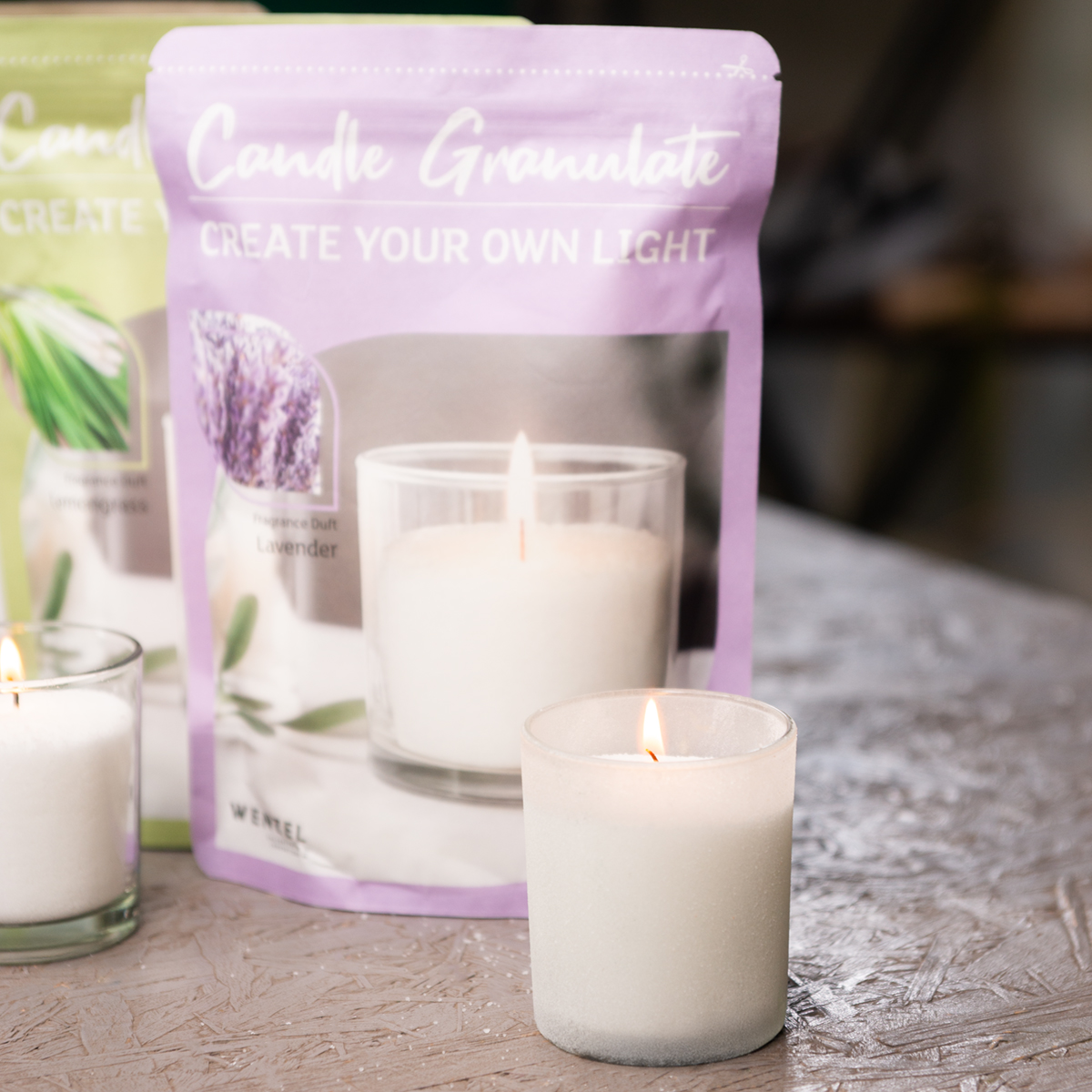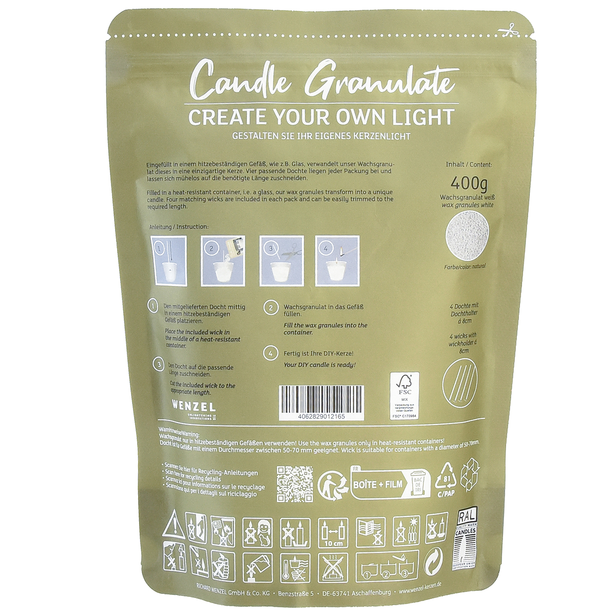 Voksgranulene er allsidige og er ideelle for stearinlys i glass. Den myke hvite fargen på granulatene gir et varmt, innbydende lys og utfyller ethvert interiør.