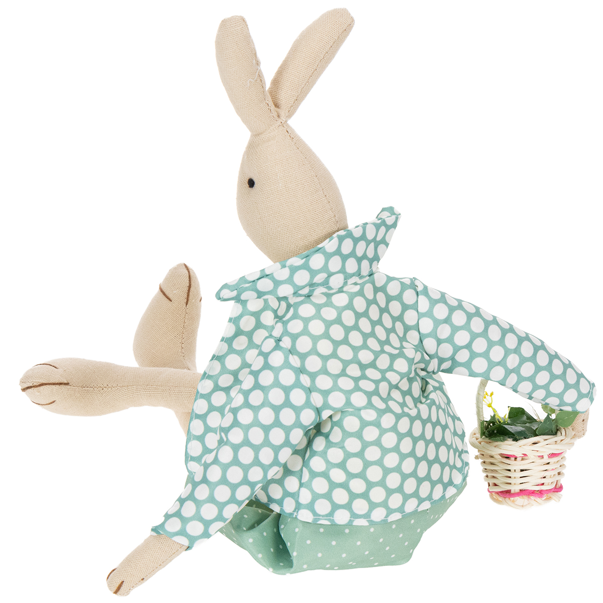 Denne kaningutten ble håndlaget med stor oppmerksomhet på detaljer. Kaninen var laget av naturstoff og kledd i en gul skjorte med hvite prikker og treknapper, bukser og matchende jakke i turkis, også den med prikkemønster. Påskeharen bærer en enkel papirsløyfe rundt halsen. Kaninmannen hadde med seg en liten plantet blomsterkurv.