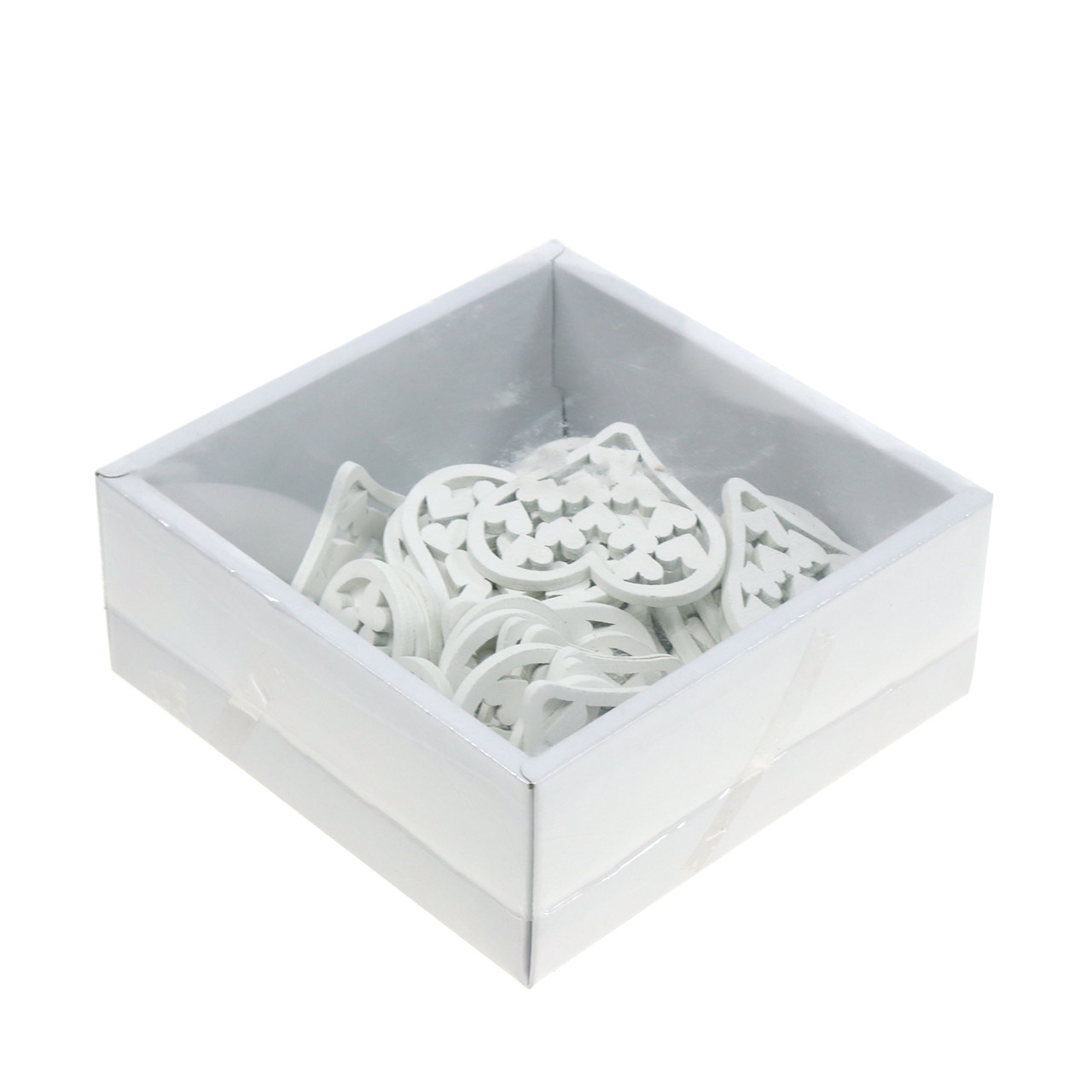 Trehjerter i hvitt leveres i en eske med 40 stykker. Trehjerter er ca 2 inches brede.