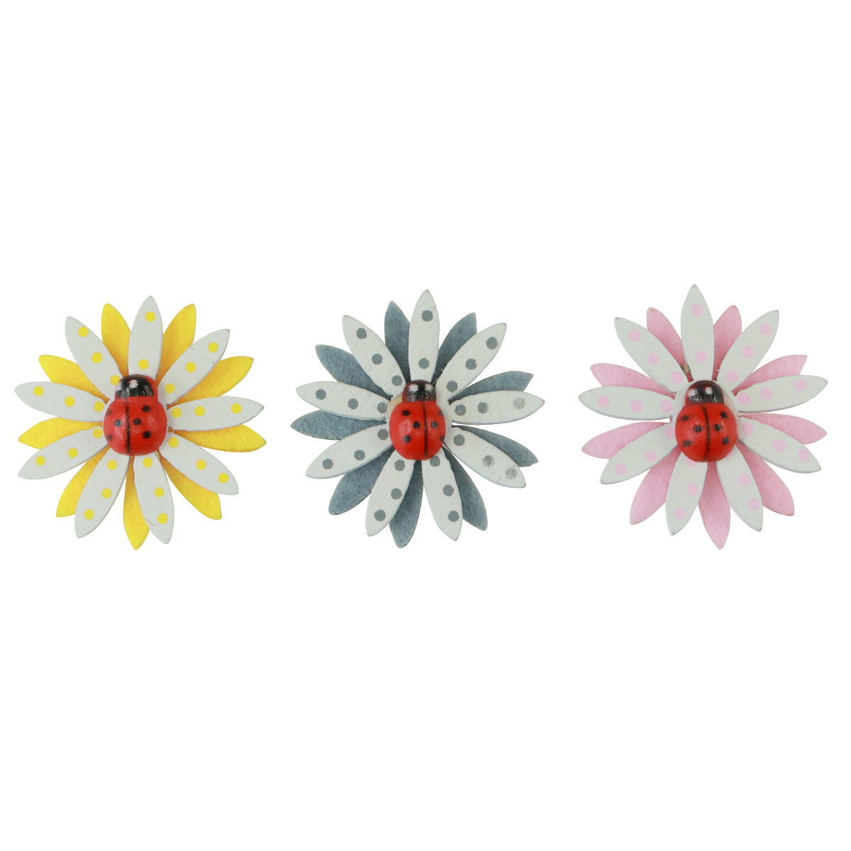 Treblomsten er laget akkurat som fargen på filtblomstene. De er forskjøvet slik at hver av bladspissene kan sees. Så du har den vakre scatter-dekorasjonen for vår og sommer i grått, gult og rosa. De små marihønene i midten av blomsten er svarte, med røde vinger, svarte prikker og hvite øyne.