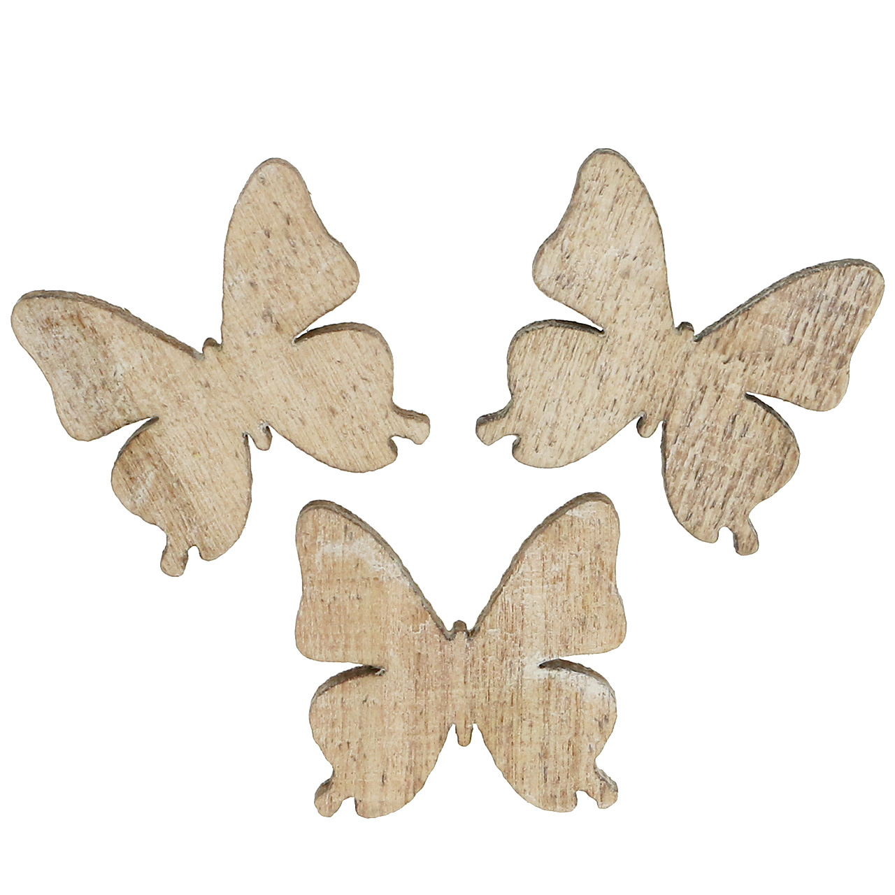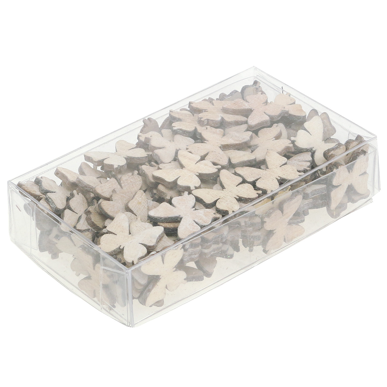 Sommerfuglen som en spredt dekorasjon laget av tre i naturlige farger leveres som et sett på 144 stykker totalt. Figurene er omtrent 2 x 2 centimeter store.