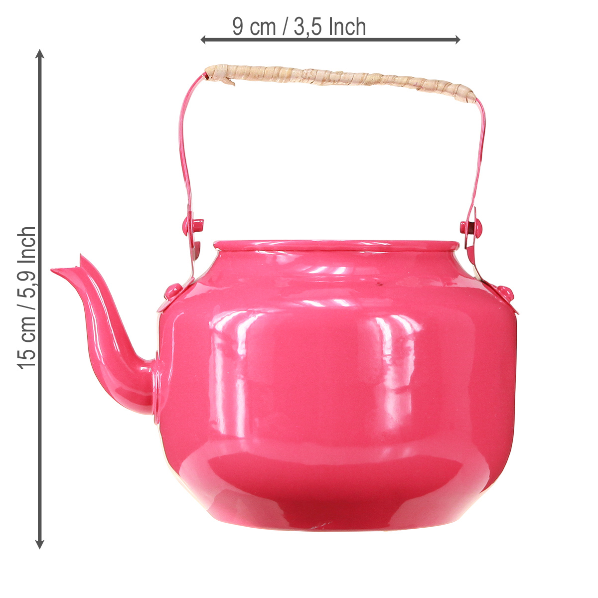 Hvorfor akkurat denne tekannen? Den praktiske størrelsen, som måler 15 cm i høyden og 11 cm i diameter, gjør den til et allsidig objekt som tjener både et dekorativt og praktisk formål. Den rosa fargen er frisk og munter, men likevel klassisk nok til ikke å være overveldende. Det robuste metallmaterialet garanterer holdbarhet og stabilitet, mens det rustikke håndtaket med bambusdetaljer komplementerer den landlige følelsen perfekt.