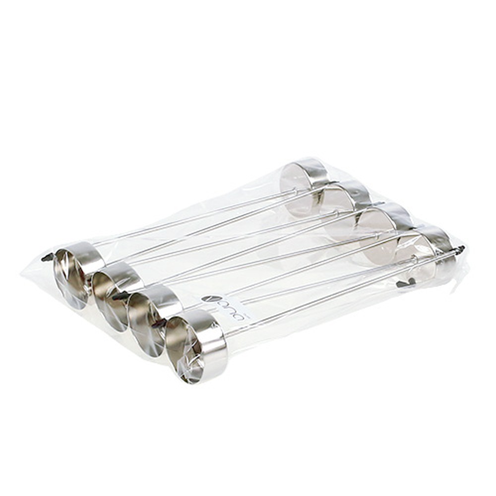 Sølv telysholderen leveres i pakker på 8 og er rundt 21 centimeter høy. Doren har en lengde på ca. 19,5 centimeter og lysholderen har en utvendig diameter på ca. 4 centimeter og en innvendig diameter på ca. 3,8 centimeter.