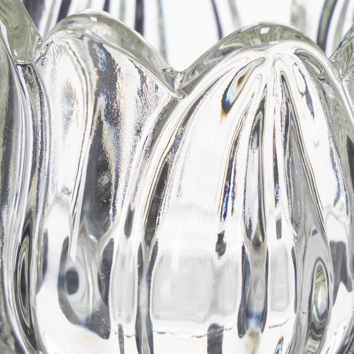 Denne telysholderen kombinerer tidløs eleganse med praktisk funksjonalitet på en dyktig måte. Laget av klart glass av høy kvalitet, imponerer den med både sin robuste konstruksjon og sitt sofistikerte, blomsterformede design. Den gjennomsiktige overflaten fremhever den delikate blomsterformen på en vakker måte, noe som gjør den til et dekorativt høydepunkt ikke bare som lyskilde, men også når den er tom.