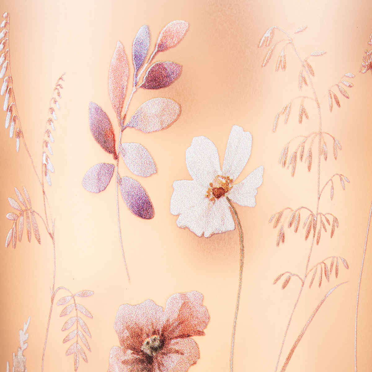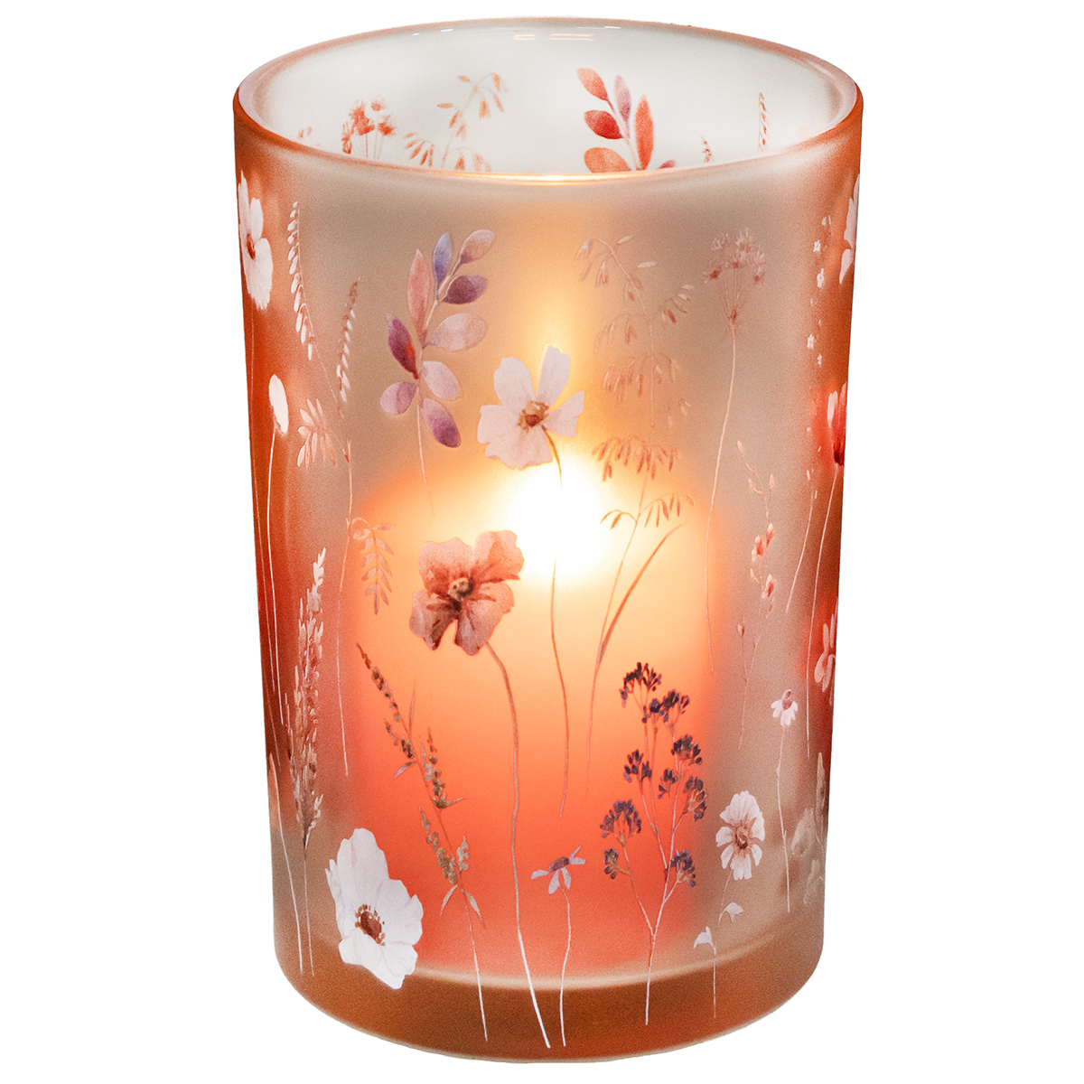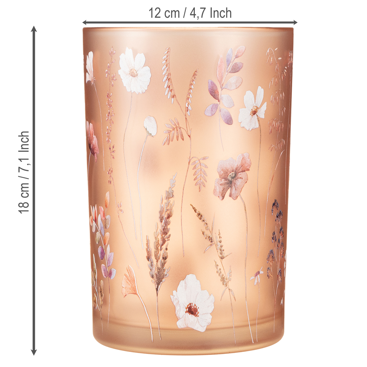 Med en høyde på 18 cm og en diameter på 12 cm er denne telysholderen et sant høydepunkt for både innendørs og utendørs bruk. Det mykt frostede glasset sprer stearinlyset i en behagelig, varm glød, mens det vakre blomstermotivet utstråler ikke bare blomstereleganse, men også naturlig sjarm. De delikate fargene, som spenner fra rosa til livlige aksenter, gjør den til et allsidig dekorativt element – ideelt for landlig stil, vintage-trenden eller rett og slett for alle som elsker en varm og innbydende atmosfære.