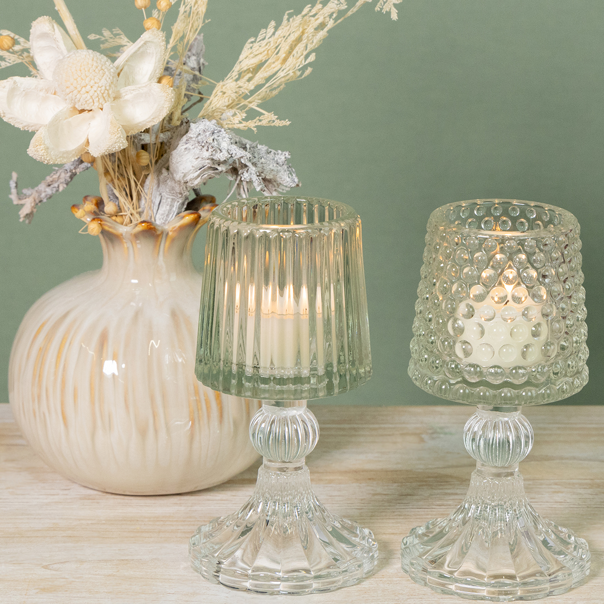 Telysholder i glass med prikker og riller i basen, H15 cm, 2 stk.