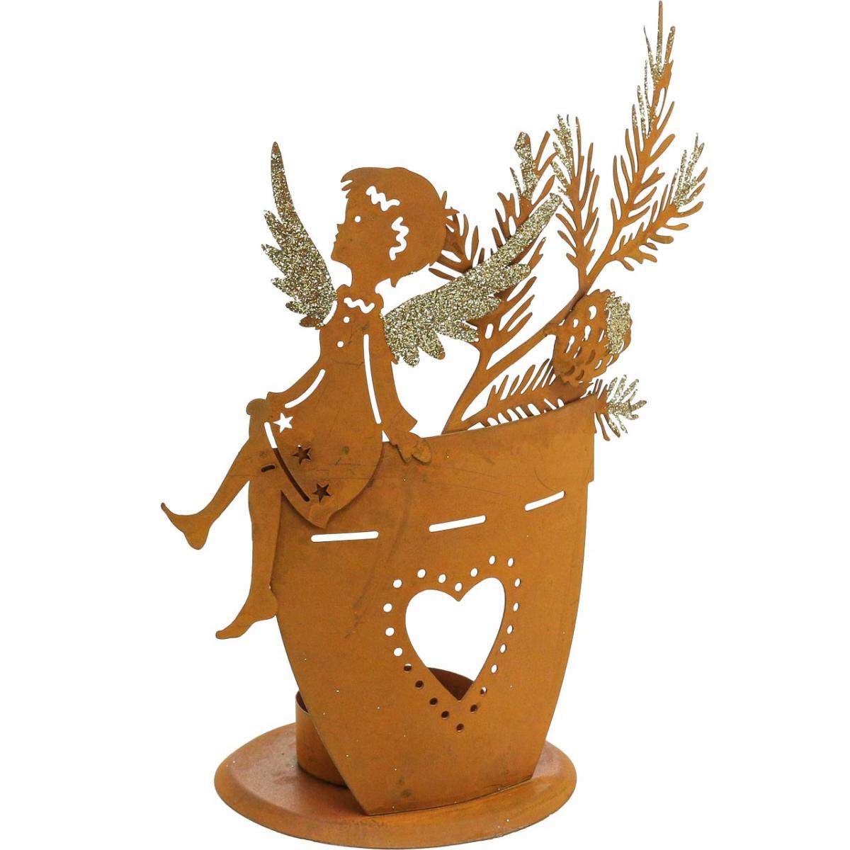 Engledekorasjonen står på en rund base med telysholder. Silhuetten av blomsterpotten viser et hjerte med en prikkramme. Kanten har også smale utskjæringer. Stearinlyset faller gjennom denne dekoren når du tenner et telys.