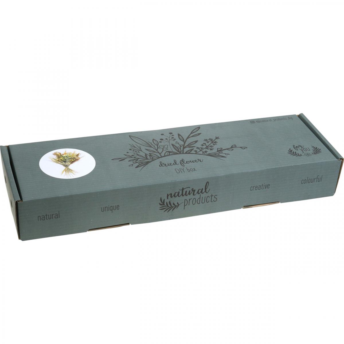 Det tørkede blomster-DIY-settet i gule og naturlige farger leveres trygt i en lukkbar, solid pappeske.