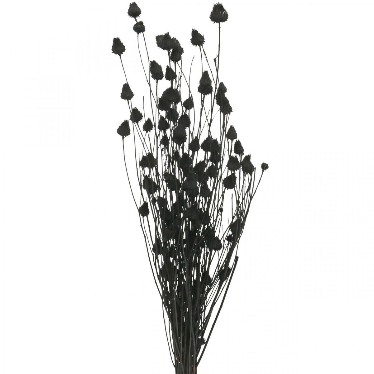 De kulesvarte blomstene til den fargede tørre tistelen troner på lange stilker i forskjellige høyder. Sammen med de små hårene får man inntrykk av at arrangementet ville ha på seg små kroner som ofte er forskjøvet i høyden. Den edle tørkede blomsten i den edle fargen svart passer til en anledning som det evige farvel.