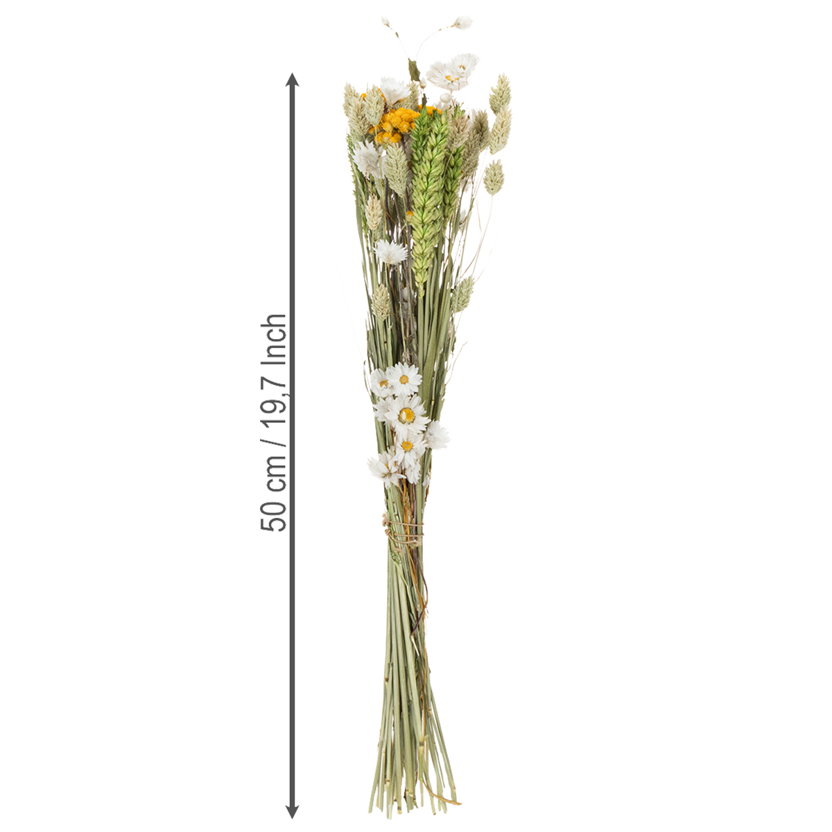 Dette imponerende 50 centimeter høye tørkede blomsterarrangementet tilbyr en rekke designmuligheter. Enten det brukes som et stilig midtpunkt på bordet eller som et dekorativt element i en tørket blomstervase, vil dette arrangementet garantert fange alles oppmerksomhet. Den nøye koordinerte kombinasjonen av korn, stråblomster, gress og andre naturlige materialer skaper et harmonisk utseende. Det er ideelt for å tilføre et snev av diskret eleganse til stuen, gangen eller soverommet.