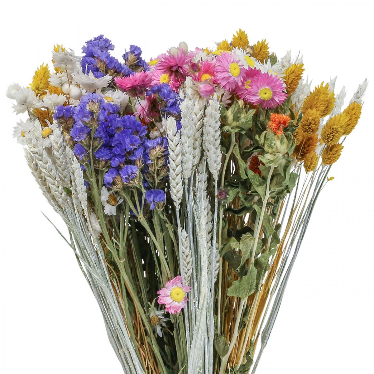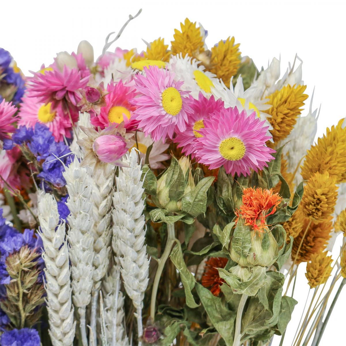 Du vil motta en veldig fyldig blandet boho-bukett med tørkede blomster laget av fargerike stråblomster, statice, phalaris og hvete.