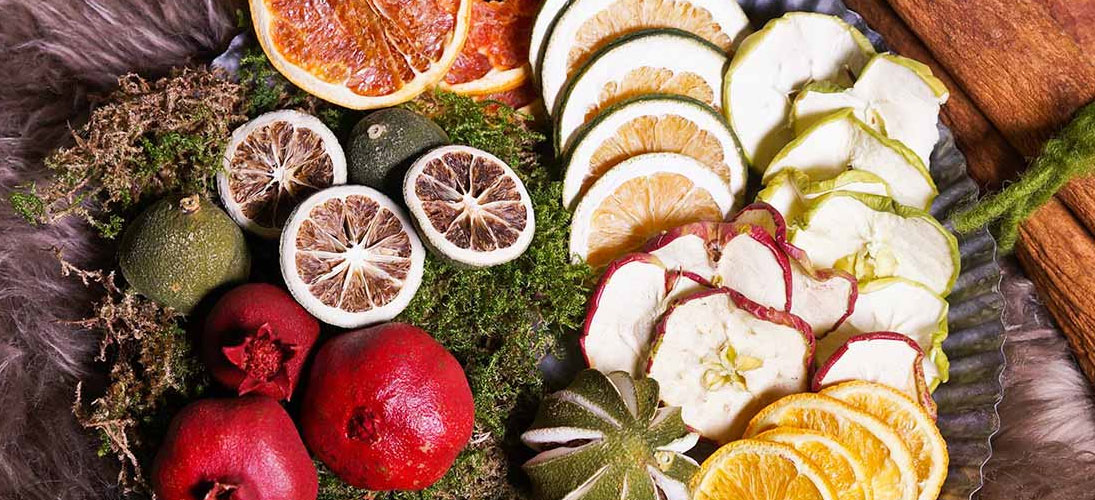 I blomsterbutikken vår finner du naturlige dekorasjoner laget av frukt som chili, lime, sitroner, belskiver, epleskiver og mini gresskar. Naturlige materialer er ideelle for høstborddekorasjoner, potpourris eller tørkede blomsteroppsatser. Kombinert med kanel kan de tørkede fruktene brukes til å trylle frem kreative jule- og adventspynt. Tørket frukt gir også vakre aksenter til buketter.