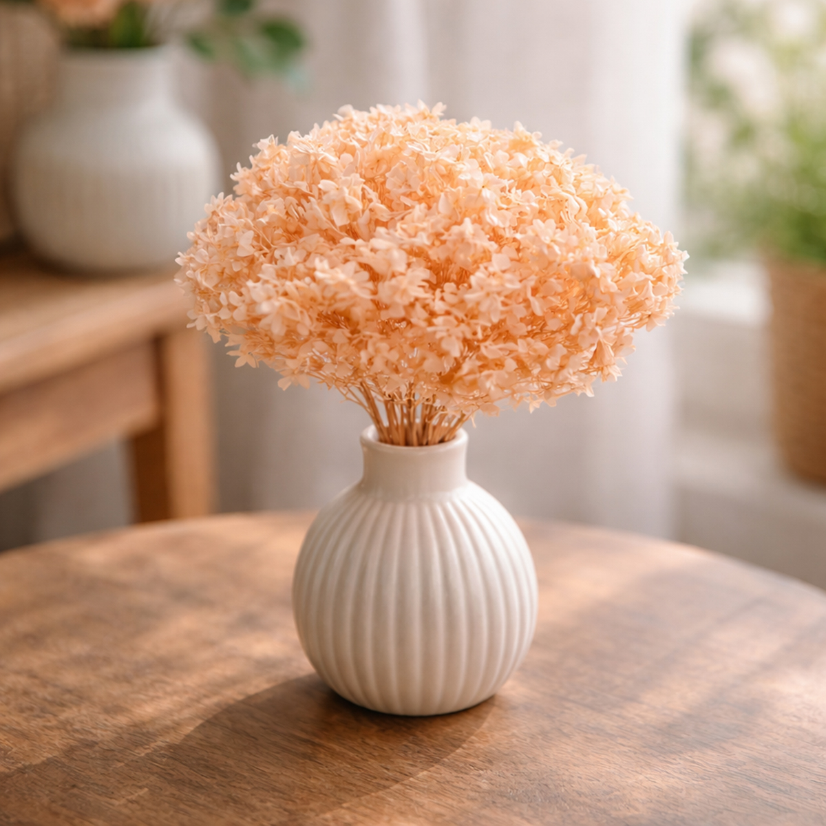 Skap en enestående atmosfære i hjemmet ditt med vår eksklusive hortensia til ditt tørkede blomsterarrangement. Med en lengde på 65 centimeter og sin delikate lysoransje fargetone, gir den et snev av eleganse til ethvert miljø, enten det er stuen, spisestuen eller til og med bryllups- og arrangementsdekorasjonene dine. Fine, høykvalitets tørkede hortensiablomster gjør dette tørkede blomsterarrangementet til et tidløst vakkert naturlig midtpunkt – uten vedlikehold. Enten du leter etter et stilig midtpunkt på bordet eller en blomsterdekorasjon til leiligheten din, kombinerer dette tørkede blomsterarrangementet varig skjønnhet med den nyeste tørkede blomster-trenden.