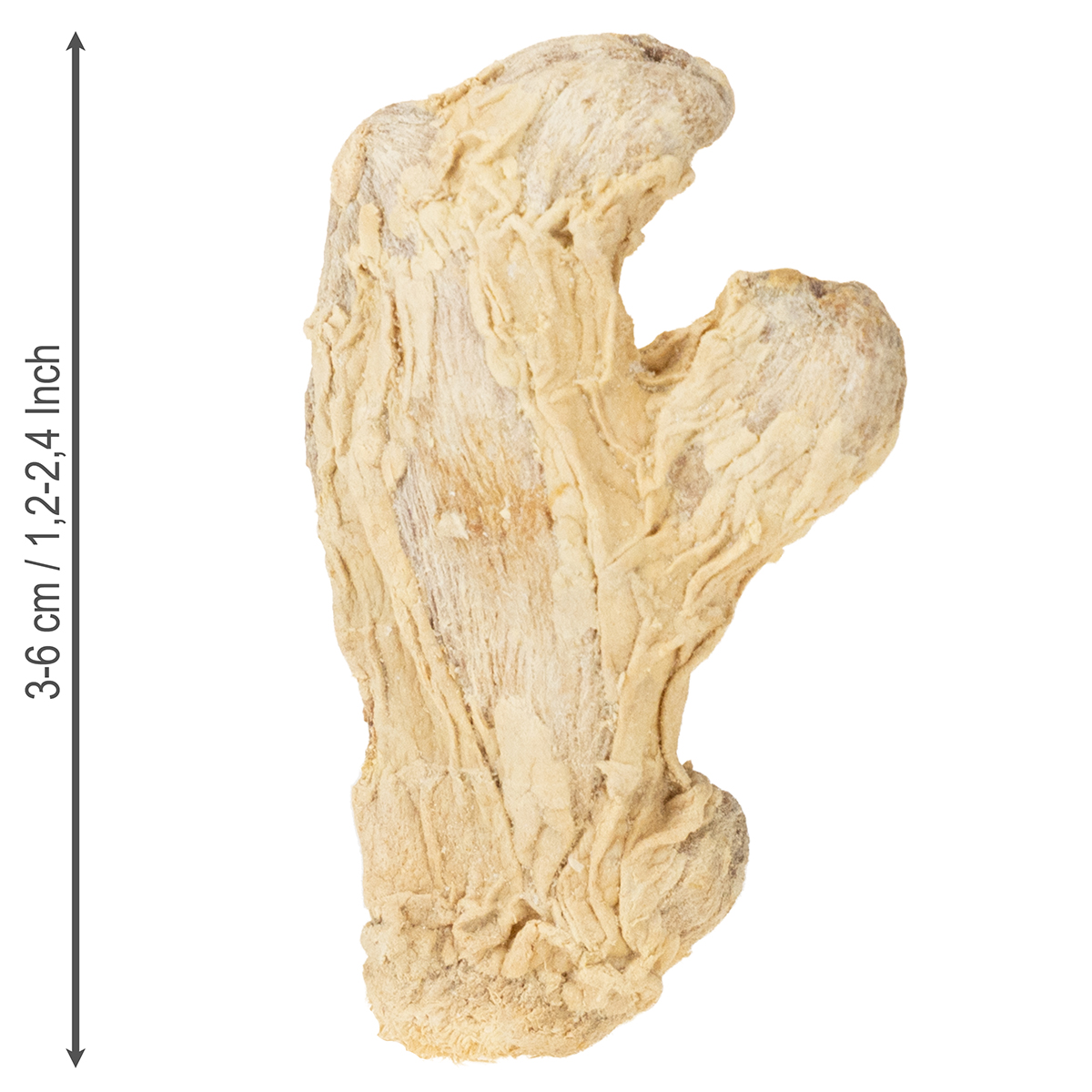 Den tørkede ingefæren leveres i en pose med 500 gram. Størrelsen på de enkelte stykkene varierer og kan være mellom 3 og 6 centimeter.