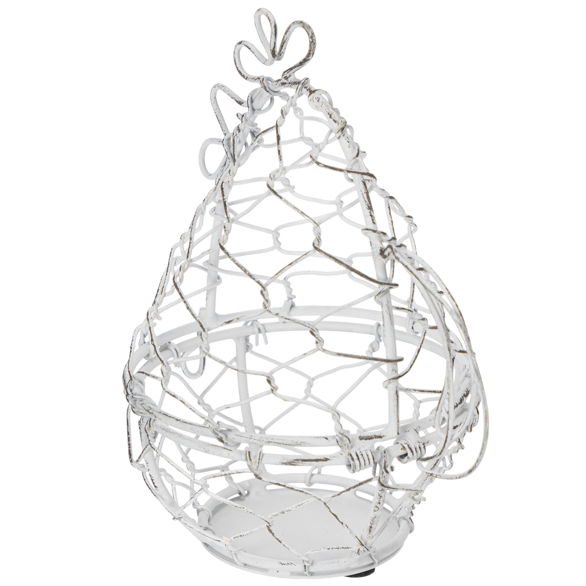 Denne trådkurven formet som en kylling er ikke bare iøynefallende, men også ekstremt praktisk. Med en høyde på 14 cm og en diameter på 12 cm er den den perfekte størrelsen til påskeeggene dine. Den robuste hvite metallkonstruksjonen fremhever det sjarmerende shabby chic-utseendet, som kombinerer diskret eleganse med rustikk stil. Det tidløse designet komplementerer en rekke interiørstiler, fra landlig og vintage til moderne.