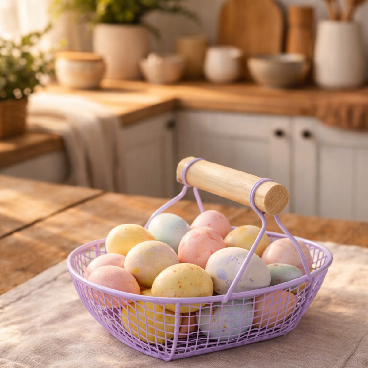 Gi hjemmet ditt et snev av stil! Denne nostalgiske trådkurven med trehåndtak imponerer med sitt minimalistiske design og harmoniske rosa og lilla fargetoner. De nøye utformede metallstaggene skaper et luftig design som er både dekorativt og praktisk. Bruk den på kjøkkenet for å stilig vise frem frisk frukt og grønnsaker, eller på kommoden for å organisere tilbehør og kosmetikk på en pen måte.