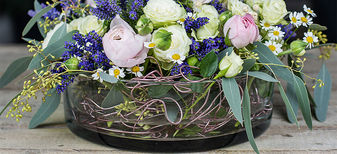 Det brede spekteret av produkter tilbyr alle materialer som kreves i profesjonell blomster. Det være seg viklingstråd eller pinteltråd for å binde kranser eller spesiell gerbera-tråd for å feste en enkelt gerbera-blomst, det er akkurat det rette verktøyet til alle formål. For produksjon av blomsteroppsatser og borddekorasjoner er kranser, romerske perler, perlenåler eller trådruller nyttige redskaper for å feste de enkelte delene.