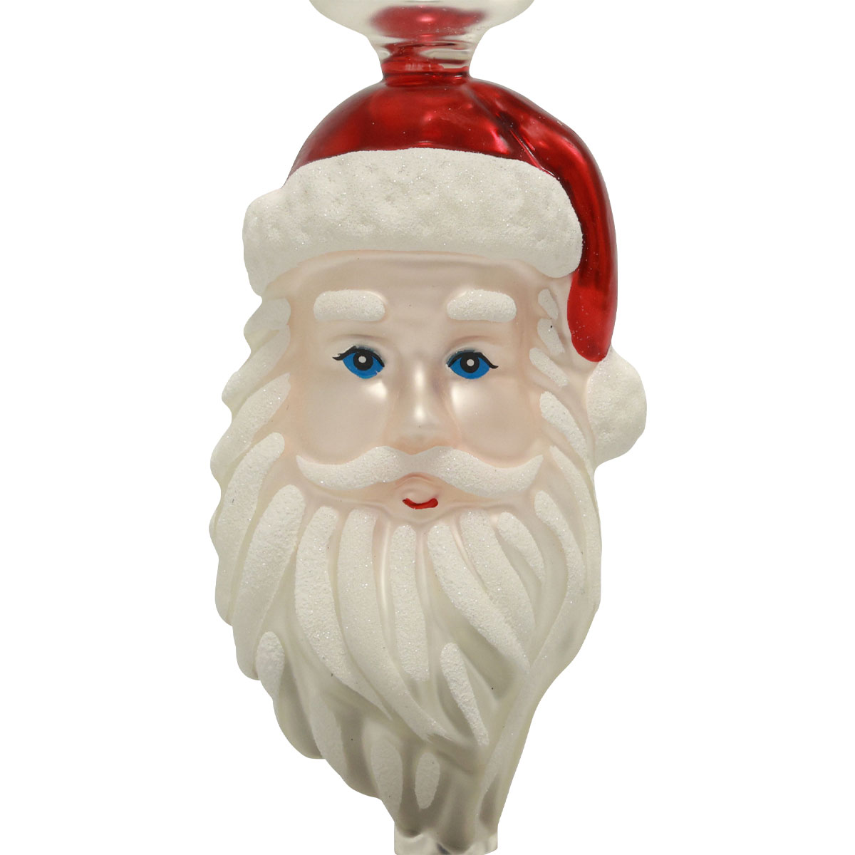 Tretoppen i glass, som har en julenissefigur, er forsiktig og sikkert pakket i en boks. Den totale lengden på juletrepynten er omtrent 34 centimeter, med diameteren på omtrent 7,5 centimeter. Åpningen har en diameter på ca 2,5 centimeter.