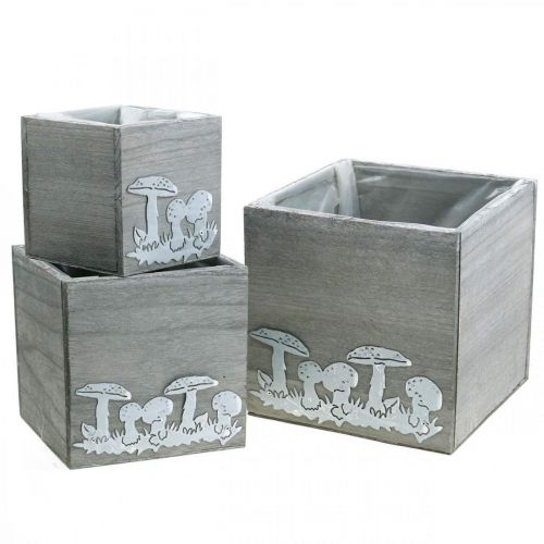 Hver blomsterkasse i trekassesettet er allerede foret med plantefilm og dekorert på utsiden med forskjellige metallsoppapplikasjoner. Denne sølv soppdekorasjonen er vasket hvit, noe som gir den en tiltalende vintage sjarm.