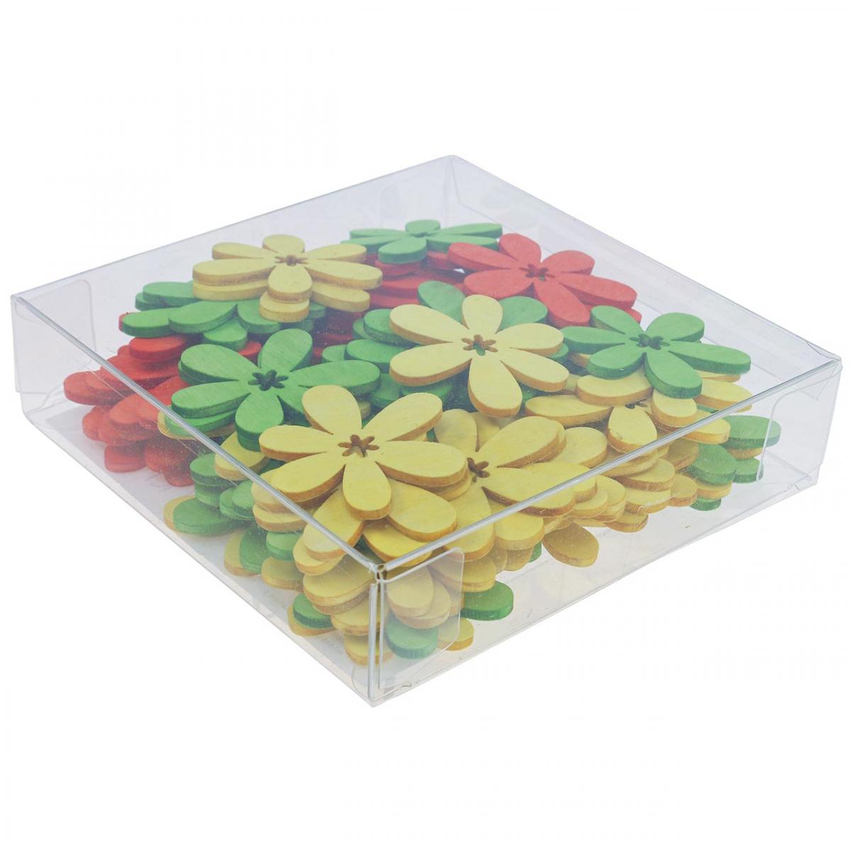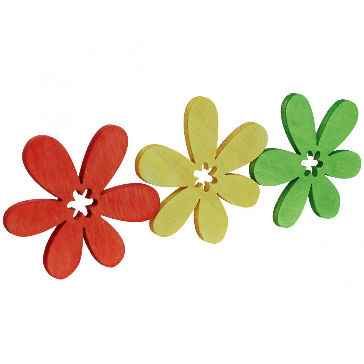 Produktnavn: Treblomster spredt pynt blomster tre gul/oransje/grønn Ø4cm 72 stk.