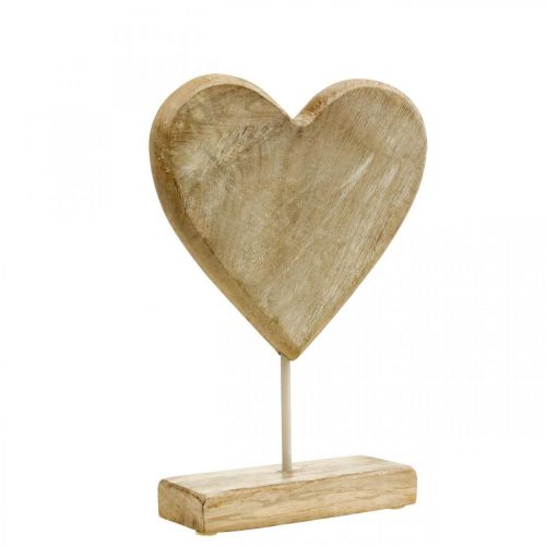 Trehjertet står på en base og er derfor ideell som treborddekorasjon. Forbindelsen mellom basen og hjertet er en avrundet, smal firkantet stang laget av hvitt metall. Med en høyde på rundt 28 centimeter er denne hjertedekorasjonen et ekte blikkfang på hver kommode og skjenk eller på brettet.