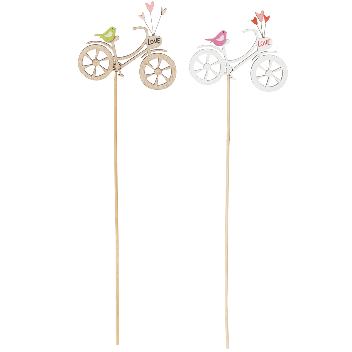 Leter du etter en spesiell dekorasjon for å bringe våren inn i hjemmet ditt? Disse trepinnene med sykkelmotiv er akkurat det du trenger for å gi stuen, balkongen eller terrassen et romantisk preg. Med delikate detaljer som en naturfarget tresykkel, små hjerter og sjarmerende små fugler, vil denne dekorasjonen garantert fange alles oppmerksomhet. Hva med et kreativt arrangement i en frisk vårbukett eller som et høydepunkt i en blomsterkasse? Pinnenes naturlige utseende passer perfekt til landlig innredning eller moderne blomsterarrangementer.