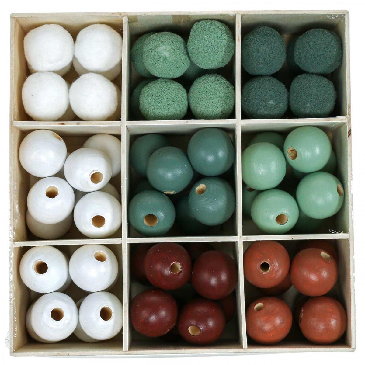 Trekulene med hull kommer i fargene mørkegrønn, lysegrønn, mørkebrun, lysebrun og hvit. Det er også åtte grønnaktige dekorative kuler uten hull laget av solid plast, som ser ut som mosekuler fra overflatestrukturen. De fire siste dekorative kulene uten hull er hvite og myke, som små snøballer. Fargene og teksturen til treperlene og dekorative kuler er ideelle for å lage høst- og juledekorasjoner.