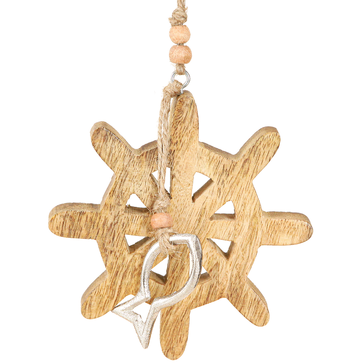 Få et friskt pust inn i hjemmet ditt med vår rattdekorasjon i tre, en unik pendel som bringer den maritime stilen direkte inn i rommene dine. Disse sjarmerende rattene, laget av tre av høy kvalitet, kompletteres av en liten metallfisk. Den varme tretonen på rattet harmonerer perfekt med den sølvglansende fisken, som er festet til en solid jutesnor. Treperlene som dekorerer jutesnoren gir et ekstra dekorativt preg og fremhever den naturlige sjarmen. Denne maritime opphengsdekorasjonen tilbyr et bredt spekter av bruksområder, fra å henge opp dekorative høydepunkter i stuen til forfriskende aksenter i blomsteroppsatser. Gled gjestene dine med en borddekorasjon i vintage-stil eller legg til stilige detaljer på døren. Åringen og trefargen varierer, så hver anheng er unik. Opplev maritim stil og håndverk kombinert i ett utsøkt dekorativt stykke!