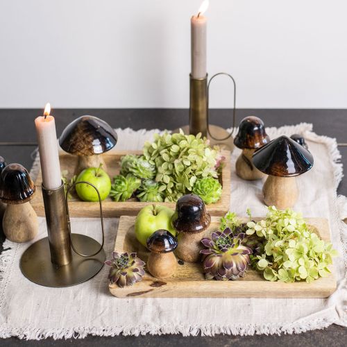 Denne tresoppen gleder seg med sin helt spesielle glans. Legg den stemningsfulle soppdekorasjonen i en bolle med mose for en glamorøs høst!Malingen er stedvis dyp brun, stedvis klar. På denne måten, avhengig av lysinnfallet, kommer også tresoppens naturlige åre til sin rett. Glasureffekten får malingen på den dekorative soppen til å skinne. I tillegg kommer det ubehandlede håndtaket, som også er laget av heltre mangotre.