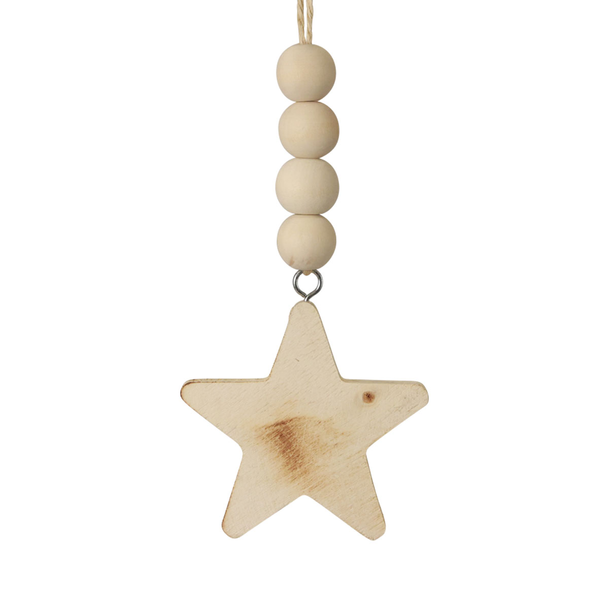 Stjernedekorasjonen er perfekt med oppheng laget av jutebånd. I tillegg til den vakre dekorative stjernen, er den rustikke jutesnoren også dekorert med fire naturlige treperler som er stilt opp på det naturlige båndet.