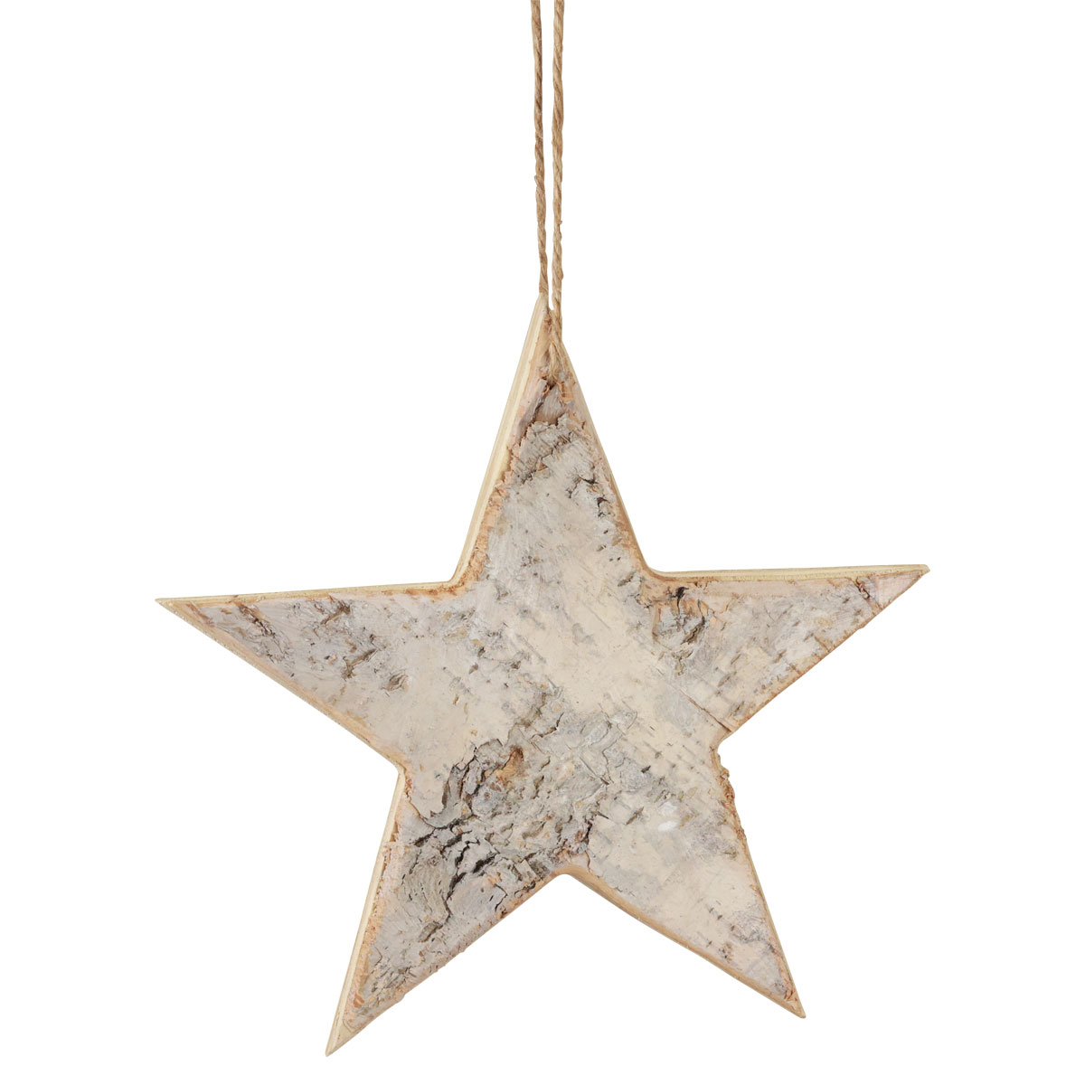 Sidene viser tydelig at denne trestjernen er lysebrun i fargen. Men det virkelige blikkfanget er den påførte bjørkebarken, som også er farget hvit. En naturfarget snor gjør den dekorative trehengeren perfekt.
