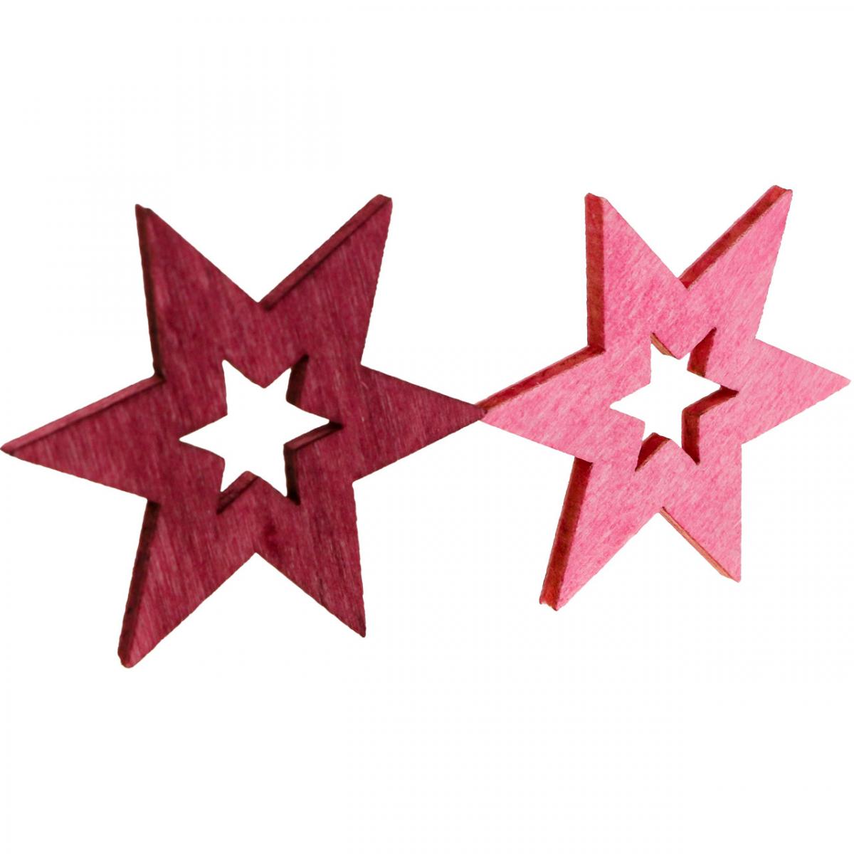 De fine treskivene i lilla og rosa har stjerneform på inn- og utside. Trestjernene er små og lette og kan enkelt festes til overflater eller gjøres om til anheng med en tråd.