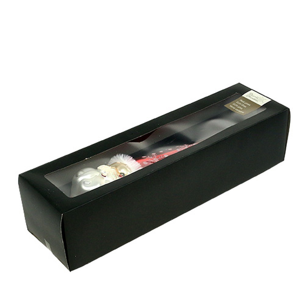 Treetoppen, som viser en figur av julenissen i rødt, er forsiktig og trygt pakket i en eske. Den totale lengden på juletrepynt er rundt 30 centimeter, med en diameter på rundt 8 centimeter. Åpningen har en diameter på omtrent 2,5 centimeter.
