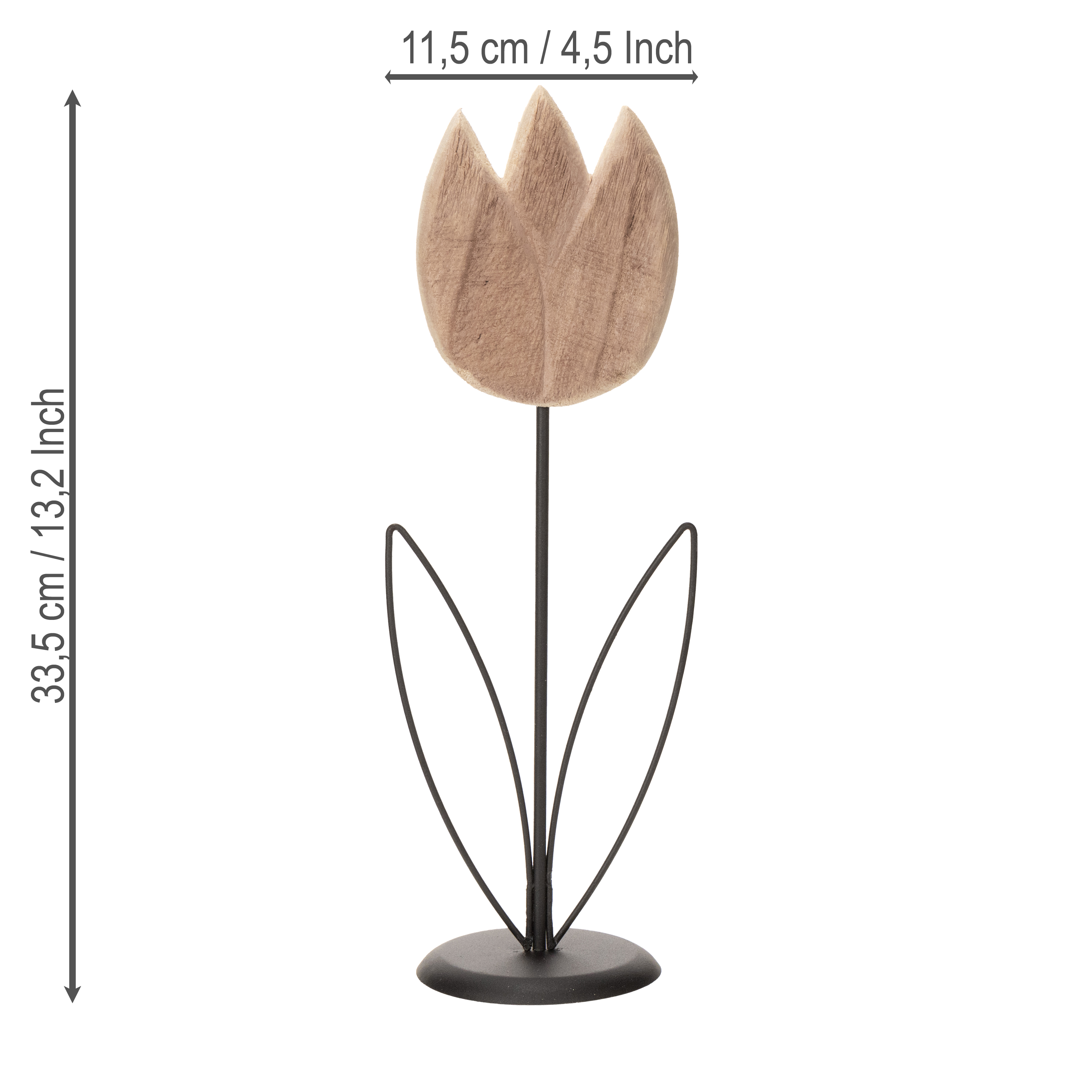 Denne tulipan-dekorasjonen utmerker seg med sitt enkle, men likevel uttrykksfulle design. Det tulipanformede hodet er laget av høykvalitets treverk, hvis naturlige åring gir det et spesielt autentisk utseende. Blader, stilk og base er laget av solid metall, noe som sikrer stabilitet. Enten du foretrekker en moderne, skandinavisk eller tidløs interiørstil, passer denne dekorative tulipanen sømløst inn i ethvert miljø. Den ser spesielt vakker ut når den kombineres med andre dekorative gjenstander laget av metall eller tre – for eksempel i et lite arrangement med stearinlys eller vaser.