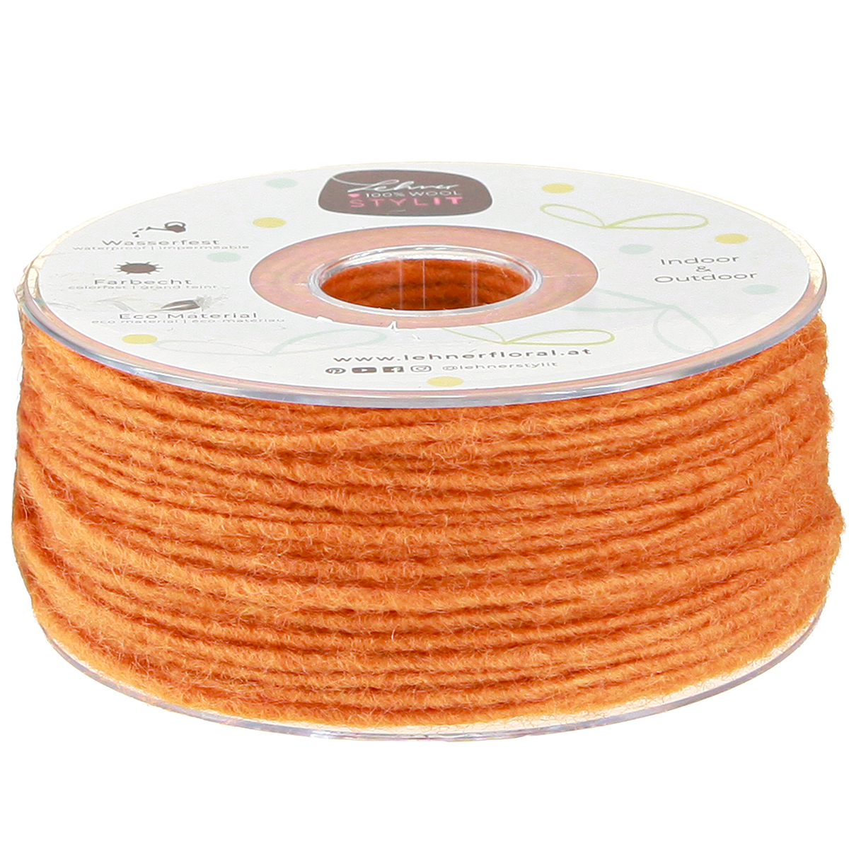 Den oransje ullsnoren er ca 100 meter lang og ca 3 millimeter tykk, selv om denne tykkelsen kan variere litt på grunn av materialets fleksibilitet. Du mottar den dekorative ledningen, laget av 75% ull og 25% jute, rullet opp på en plastrulle.
