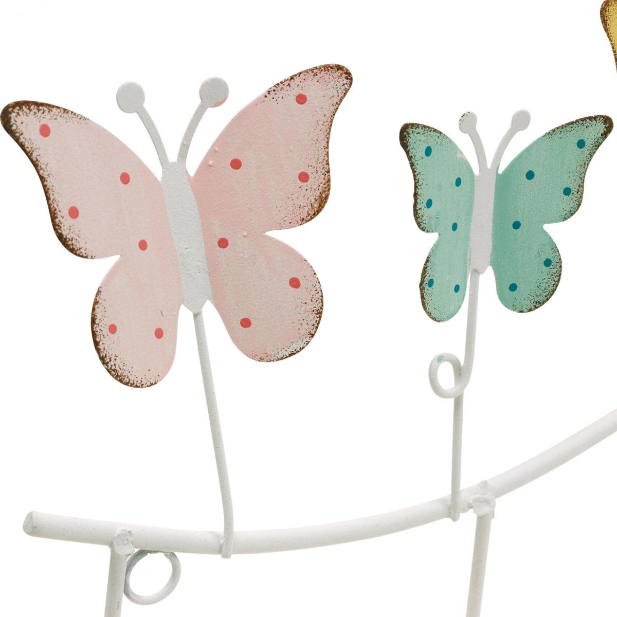 Metalldekorasjonen består av en buet tverrstang med fem buede kroker i hvitt. Syv forskjellige fargede dekorative sommerfugler er festet på toppen. Metallsommerfuglene har en hvit kropp og vingene er rosa med rosa prikker, lyseblå med turkise prikker, gule med oransje prikker og grønne med hvitt mønster. På kanten er de dekorative sommerfuglene lett dekket med litt patina.